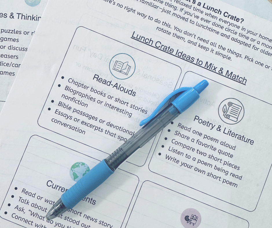 Our Lunch Crate time usually lasts about 30–45 minutes. It’s a natural pause in our homeschool routine and has become one of my favorite parts of the day.